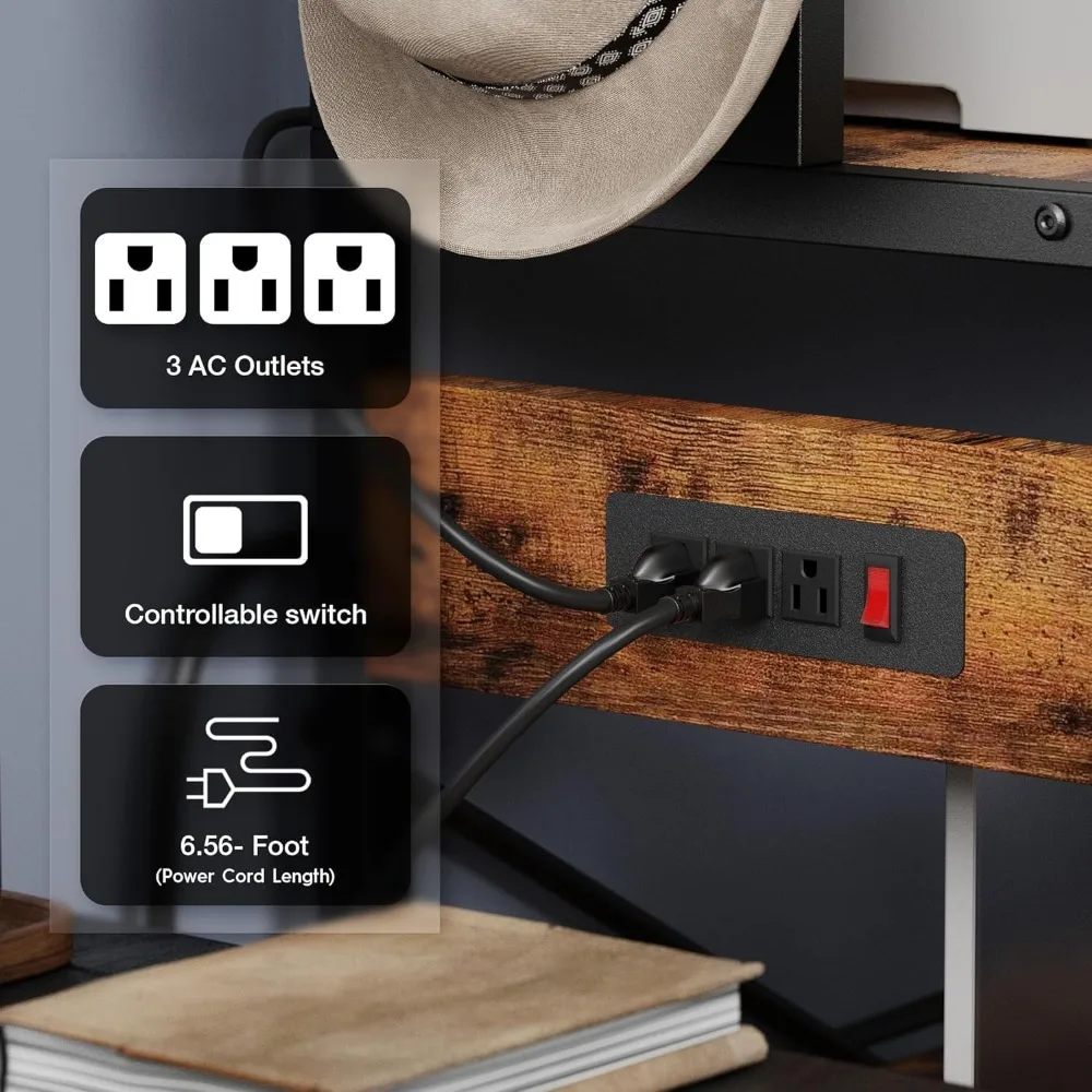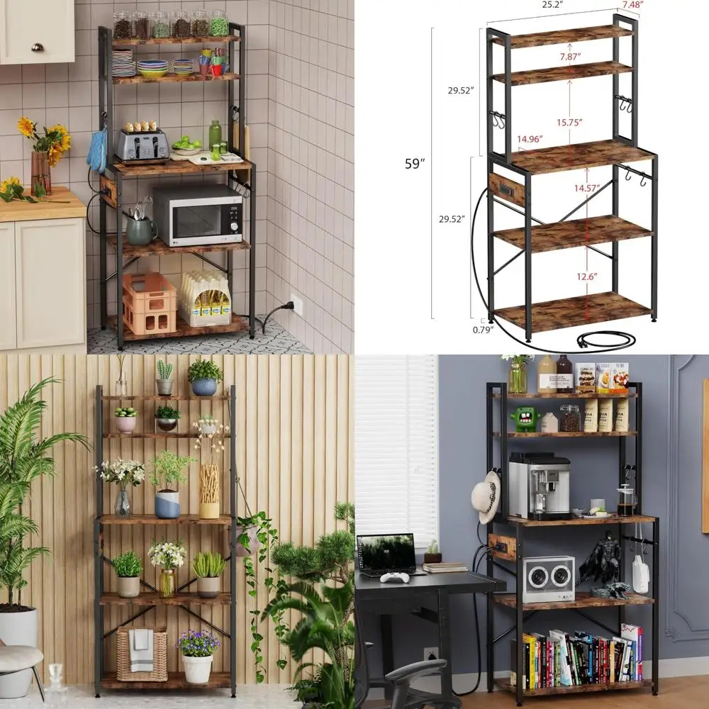 This item is a versatile kitchen storage rack crafted from particle board and iron pipe. It features a handy power outlet system with three sockets and an air switch button, allowing you to conveniently charge your coffee makers, toasters, or bread makers without relocating them. The rack's design is not only stylish for the kitchen but also adaptable as a coffee stand, microwave oven stand, bakers' rack, flower rack, printer stand, or even a plant stand on the balcony, seamlessly blending with your living space. The storage rack offers a 5-tier shelf system, with the top shelf ideal for storing spices, oils, sugar, and tea. The middle shelf can accommodate coffee makers, microwaves, and toasters, while the bottom two shelves provide ample space for everyday essentials or cookware, making it an excellent choice for small kitchens. Built with a sturdy metal frame and durable particleboard, this kitchen storage rack ensures long-lasting use. It includes "X" shaped pieces for enhanced stability and is equipped with four adjustable feet that protect your floor from scratches and adapt to uneven surfaces. The storage rack boasts an industrial retro style, with a rustic brown engineered tabletop and matte black steel that combine for an elegant look. The natural wood texture of the bakers' racks for kitchens can easily harmonize with modern or rustic furniture, adding charm and beauty to your home. Assembly is straightforward, with the kitchen bakers' racks measuring 25.2" in length, 14.96" in depth, and 59" in height. A manual with detailed operation instructions is provided, along with all necessary hardware and tools, and each accessory is labeled for easy installation. Customer service is available before and after your purchase, so feel free to reach out with any questions.