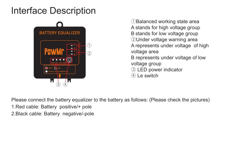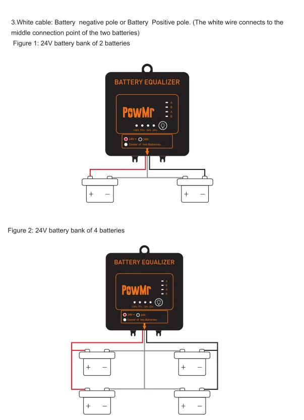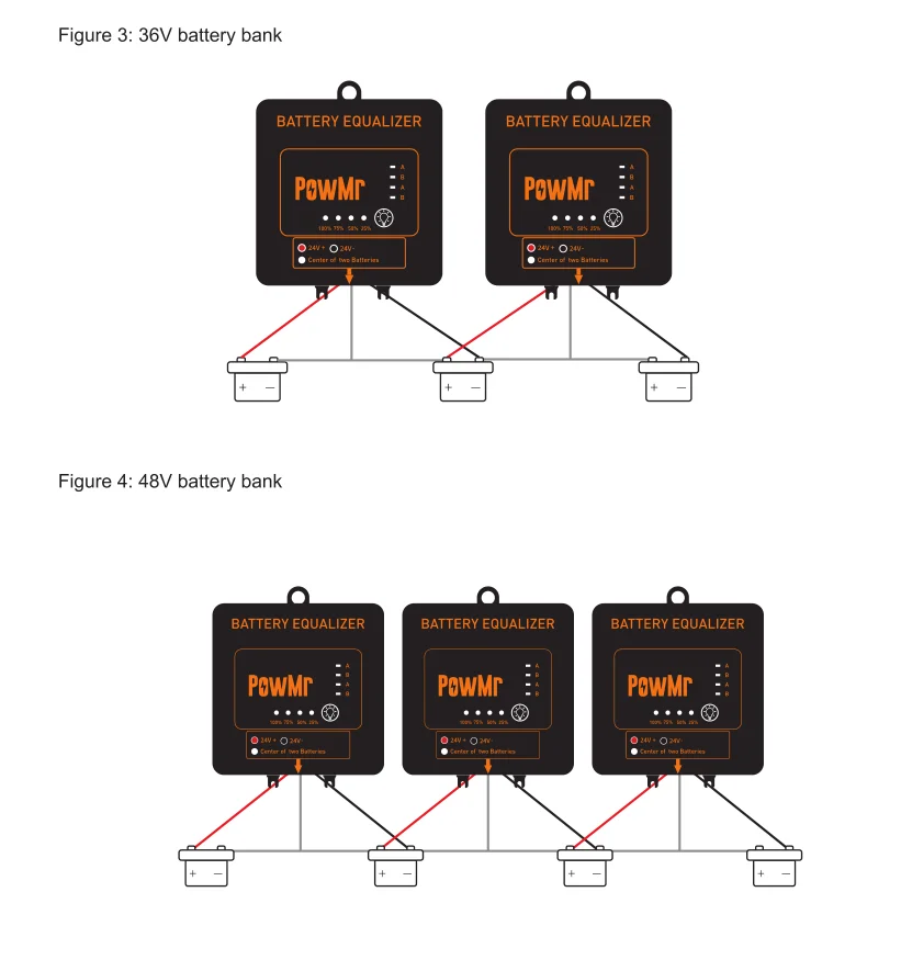 【Equalizer for parallel or row battery packs】: The 24V battery equalizer can connect two 12V lead-acid (AGM gel flood) batteries by default. The maximum compensation current is 5A. Several 24V equalizers can be connected in parallel at 24V or higher.