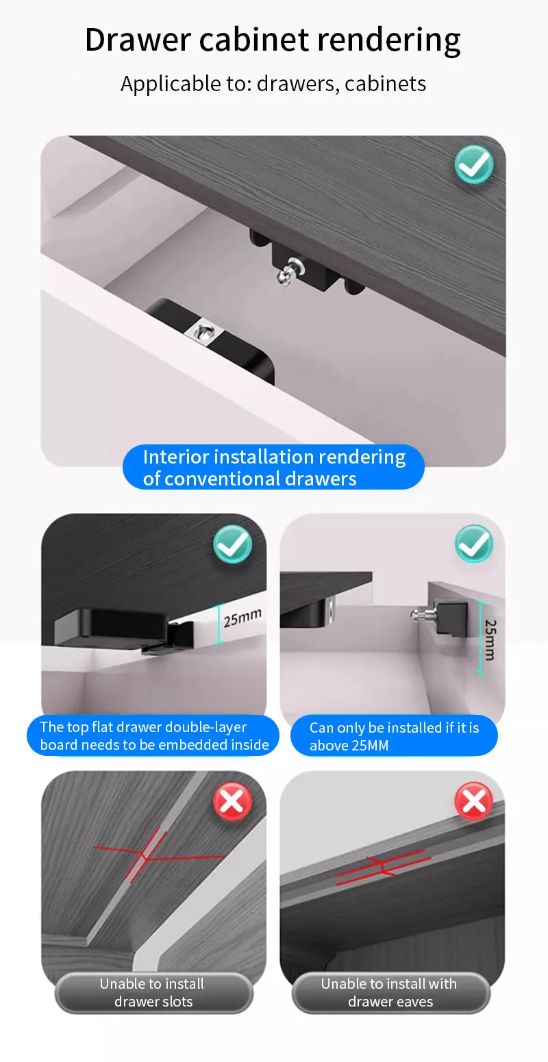 Invisible installation is free of punching. After the installation is completed, it will not affect the appearance, nor will it damage your cabinet.