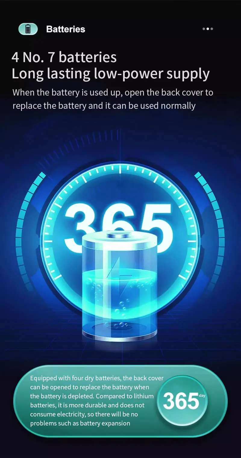 Low energy consumption design. Energy-saving technology is newly upgraded with low-loss energy-saving chips, and the replacement cycle of dry batteries is expected to be used for 1-2 years.