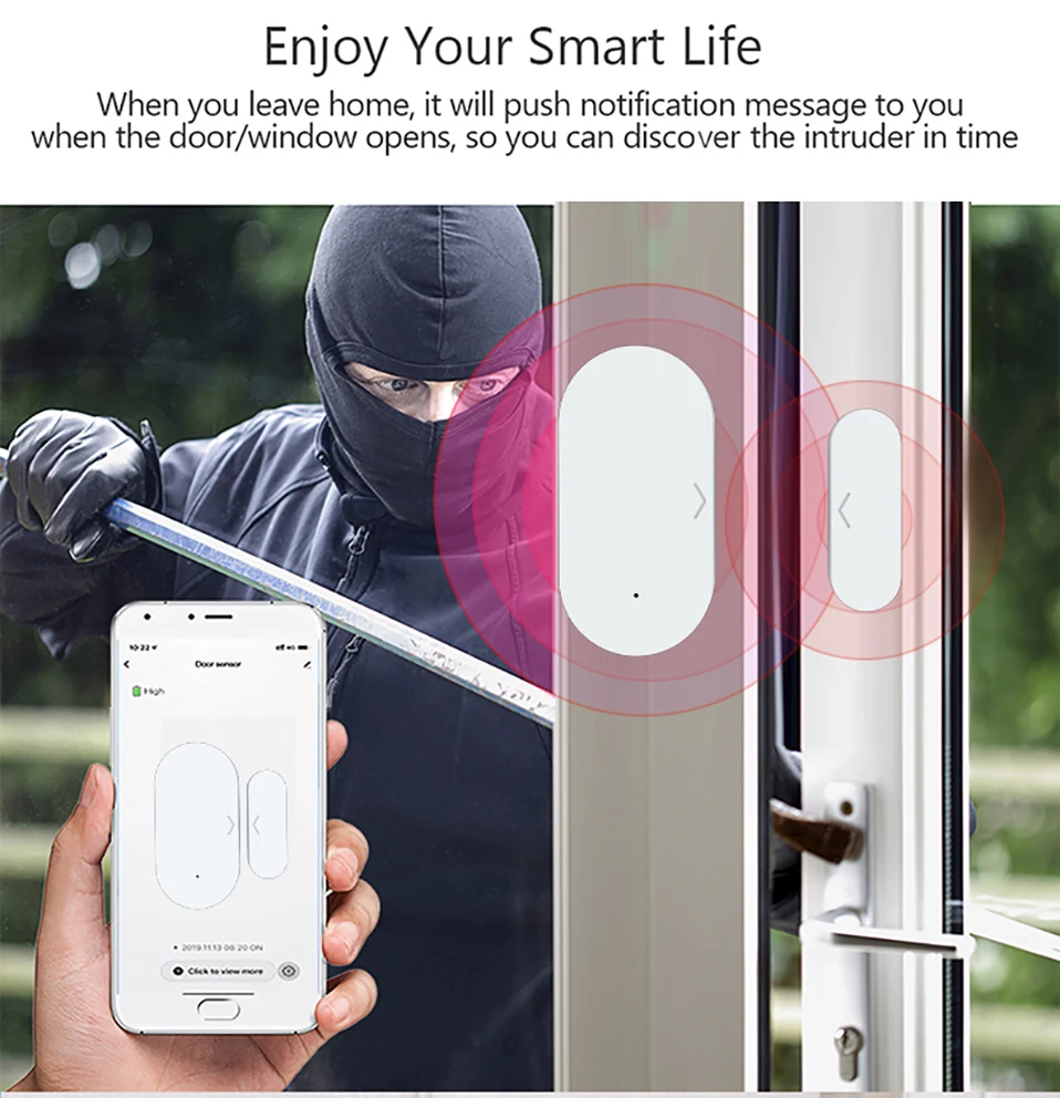 Whenever the sensor is triggered to open/close, it will send alarm to alert you that someone opens your door or window.