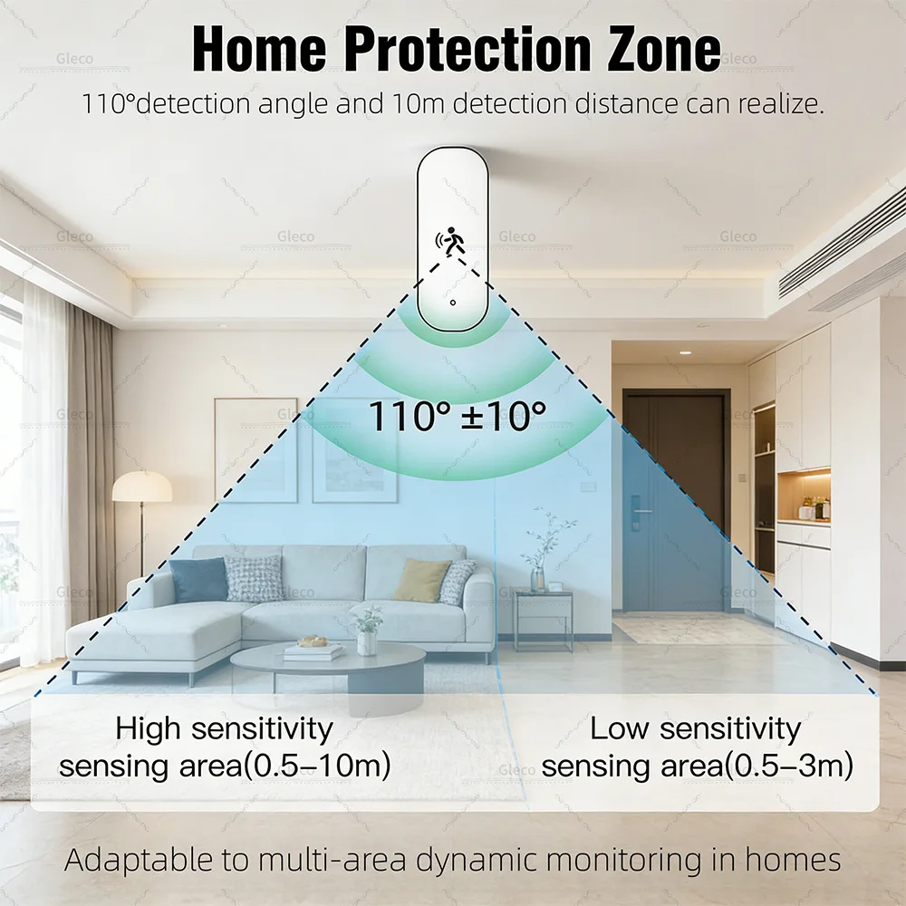 Adaptive Detection Zones: Configurable high-sensitivity (0.5–10m) and low-sensitivity (0.5–3m) areas.